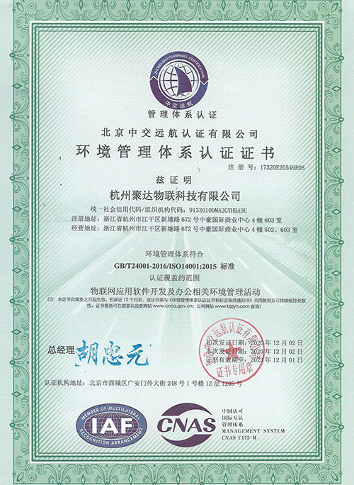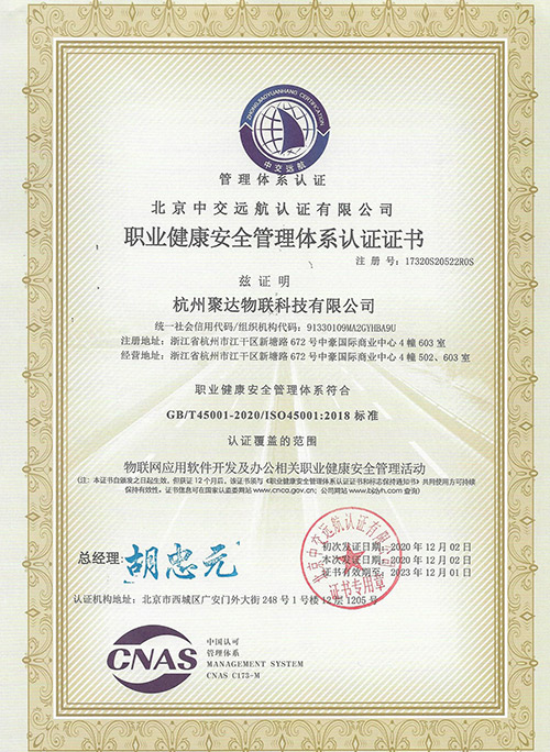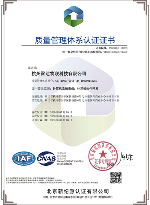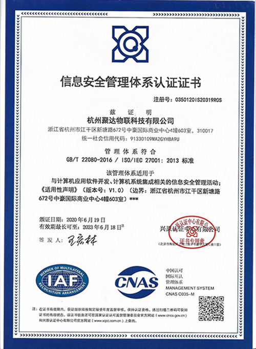 聚達物聯(lián)科技已榮獲多項權(quán)威認證證書,包括ISO9001質(zhì)量管理體系認證、ISO27001信息安全管理體系認證、職業(yè)健康安全管理體系認證證書、環(huán)境管理體系認證證書。