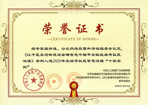 聚達物聯(lián)科技打造的江干區(qū)采荷街道觀音塘智慧中腦平臺案例入選2020年度城市社區(qū)智慧治理“十佳案例”。