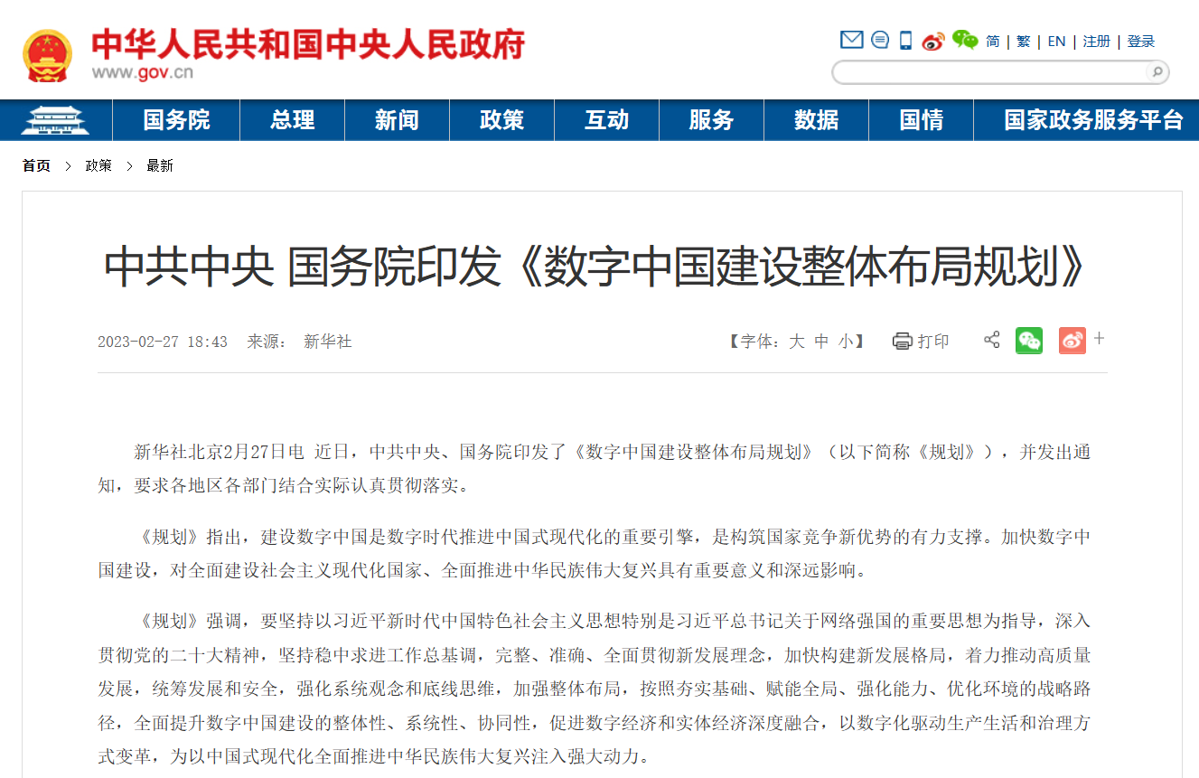 根據(jù)新華社報(bào)道,近日,中共中央、國(guó)務(wù)院印發(fā)了《數(shù)字中國(guó)建設(shè)整體布局規(guī)劃》?!兑?guī)劃》涉及數(shù)字經(jīng)濟(jì)、數(shù)字政務(wù)、數(shù)字社會(huì)、數(shù)字文化以及數(shù)字生態(tài)文明等方面的內(nèi)容,這將對(duì)智慧城市、未來社區(qū)建設(shè)產(chǎn)生重要影響.